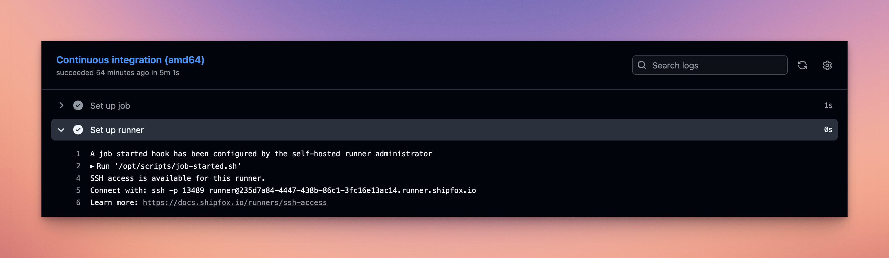 Shipfox exposes an SSH command directly in the CI logs, allowing developers to connect instantly to the running CI environment.